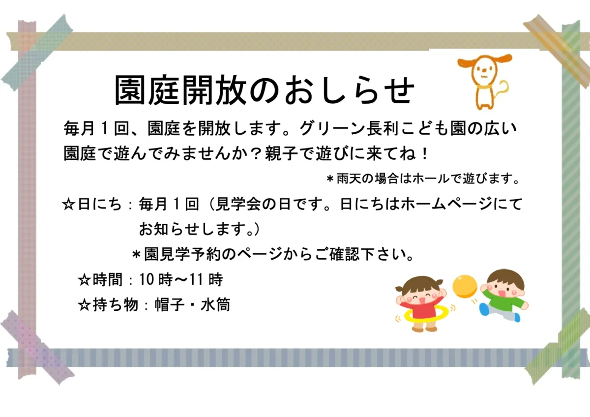 毎月1回、園庭を開放します。グリーン長利こども園の広い園庭で遊んでみませんか?親子で遊びに来てね!